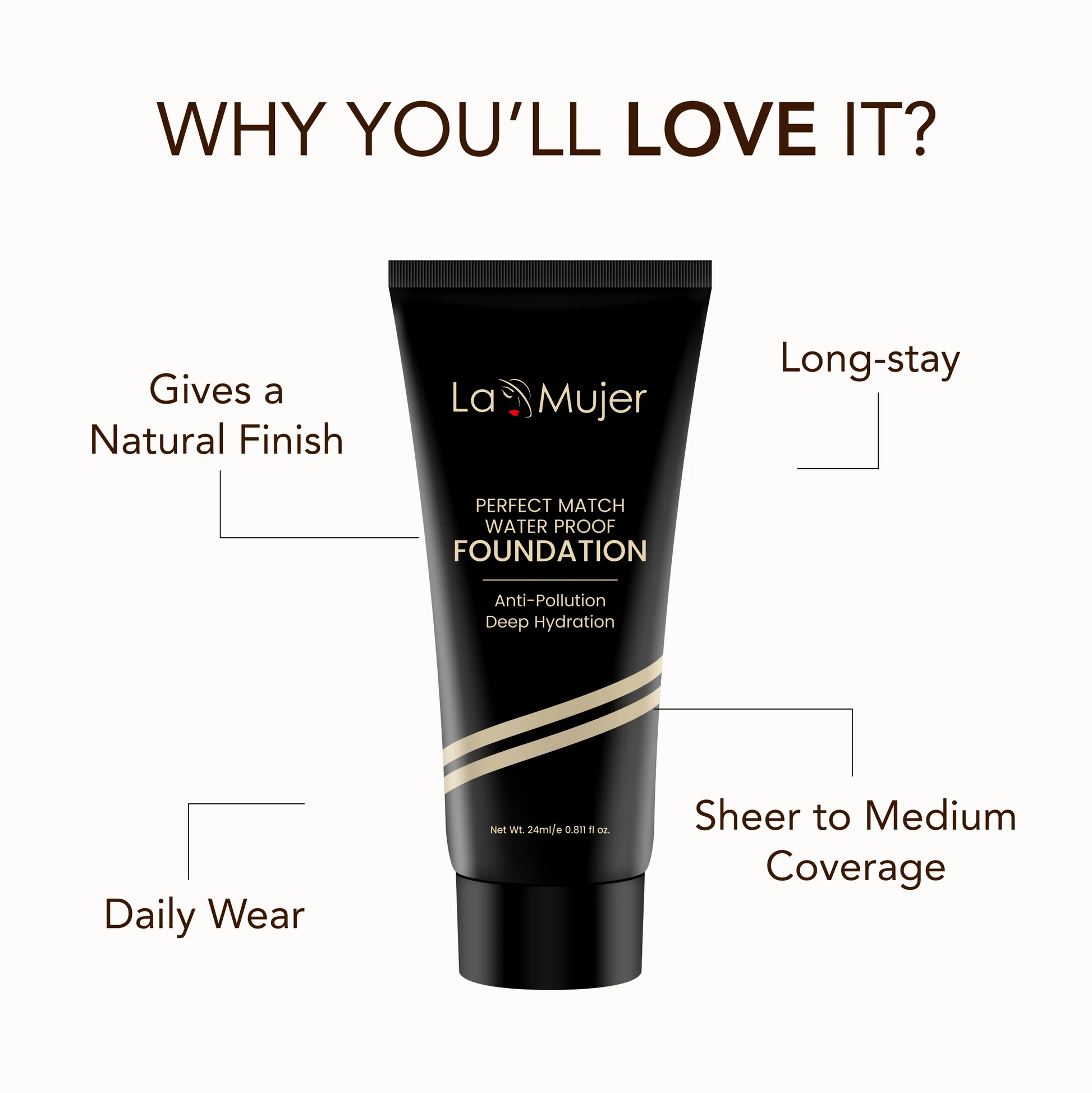 Experience the unshakeable confidence of La Mujer's Waterproof Foundation, crafted to defy water, sweat, and humidity.