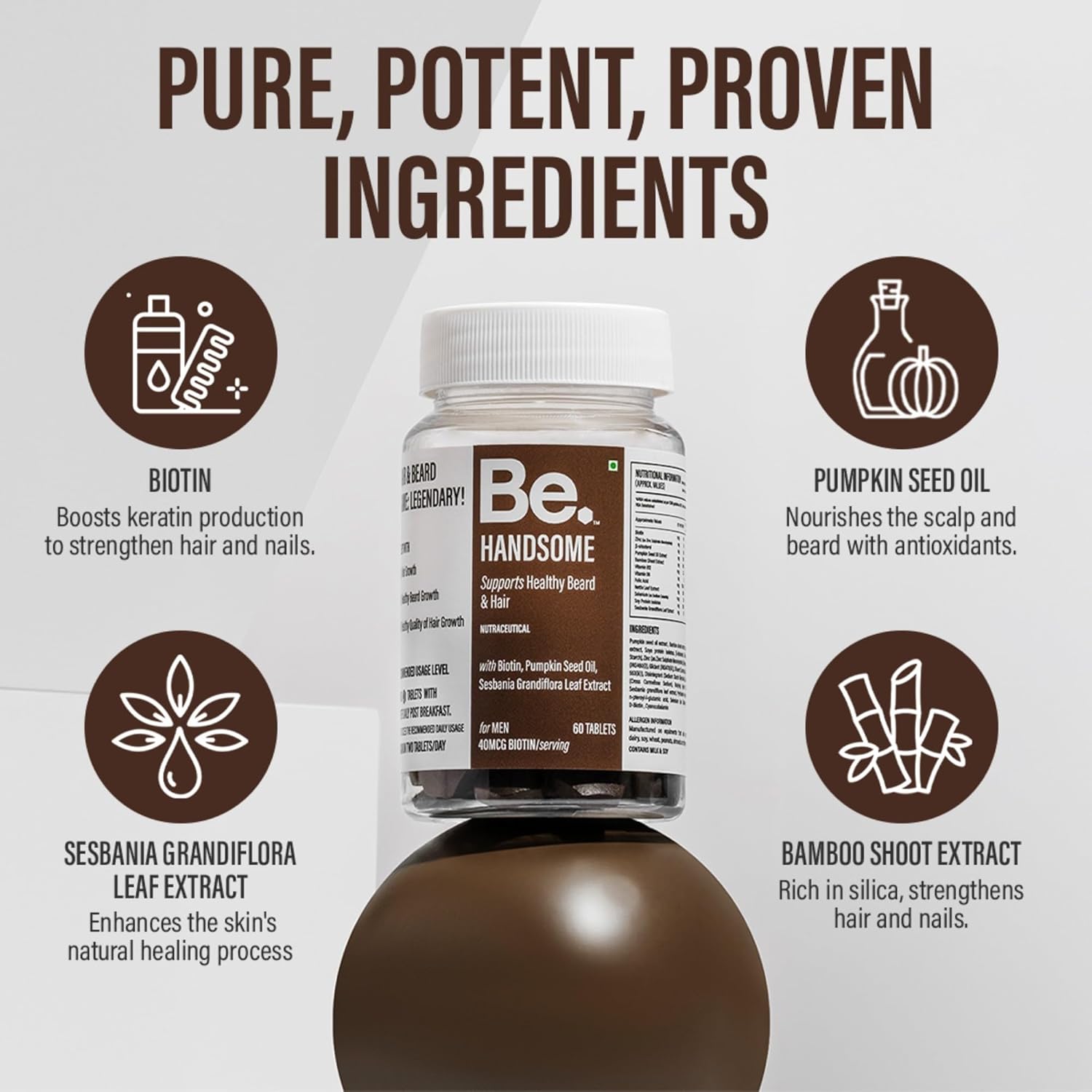 Be. Handsome is a specialized daily supplement formulated to strengthen and nourish hair and beard from within. Enriched with Biotin, Pumpkin Seed Oil, and essential vitamins, it helps support thicker hair growth, fuller beards, and overall scalp health for men who prioritize grooming and vitality.