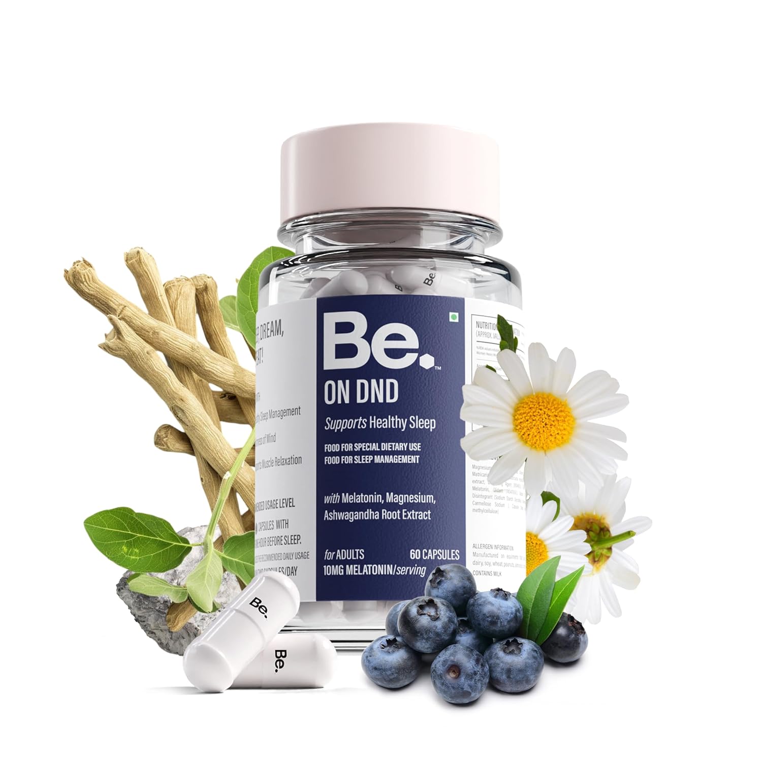 Discover restful, restorative sleep with Be. On DND—an advanced natural formula designed to help you unwind and wake up refreshed. Each capsule blends Melatonin (5 mg), Ashwagandha, Chamomile, and Magnesium to naturally support deep, uninterrupted rest.