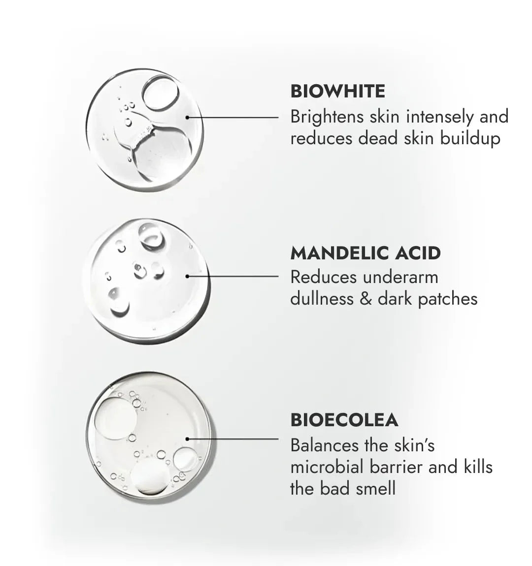 This roll-on contains BioWhite which lightens dark armpits, Mandelic Acid which removes dead skin cells and Bioecolea which balances the microbial barrier.