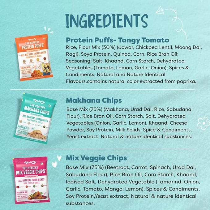 Protein Puff (Tangy Tomato): Made with jowar, moong dal, ragi, quinoa & soya protein. Seasoned with tangy tomato, garlic & lemon.