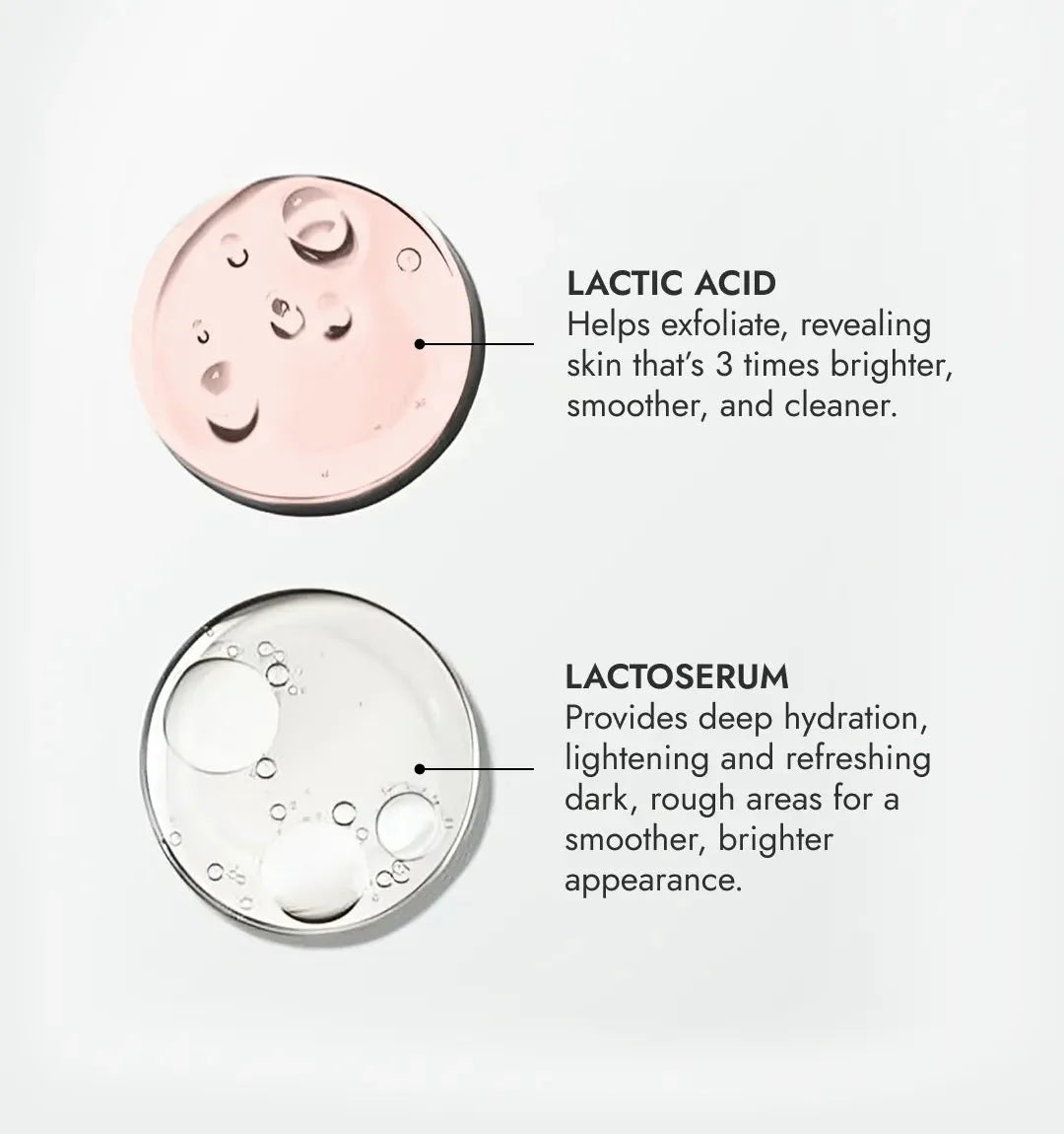 Lactic Acid – gently exfoliates and brightens Lactoserum – calms skin and supports an even tone